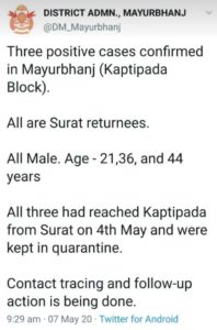ବାରିପଦା(ନିରପେକ୍ଷ ଖବର)ତା୦୭/୦୫/ରାଜ୍ୟରେ ଆଜି କରୋନ ମ୍ୟାପରେ ମୟୁରଭଞ୍ଜ ଯୋଡ଼ି ହୋଇଛି ।ଦିନକରେ ୩ଜଣ କରୋନା ରୋଗୀ ଜିଲ୍ଲାରେ ଚିହ୍ନଟ ହୋଇଛି। ଚିନ୍ହଟ ହୋଇଥିବା ରୋଗୀମାନେ ସୁରତ ଫେରନ୍ତା ପ୍ରବାସୀ ବୋଲି ଜଣାପଡ଼ିଛି। ଏ ବାବଦରେ ସ୍ୱାସ୍ଥ୍ୟ ଓ ପରିବାର କଲ୍ୟାଣ ବିଭାଗ ସୂଚନା ଟ୍ୱିଟ୍ ମାଧ୍ୟମରେ ଦେଇଛନ୍ତି। ଚିହ୍ନଟ ହୋଇଥିବା ରୋଗୀମାନେ କ୍ୱାରେନଟାଇନ ଥିଲେ। ସେମାନେ ହେଲେ ମୟୁରଭଞ୍ଜ ଜିଲ୍ଲାର କପ୍ତିପଦା ବ୍ଲକର ପୋଡାଡିହାରୁ ଜଣେ ଓ ପିଙ୍ଗୁ ଅଞ୍ଚଳରୁ ଦୁଇ ଜଣ ବୋଲି ଜିଲ୍ଲା ପ୍ରଶାସନ ପକ୍ଷରୁ ସୂଚନା ମିଳିଛି। ସେମାନଙ୍କ ବୟସ ଯଥାକ୍ରମେ ୨୧,୩୬ ଓ ୪୪ ବୋଲି ଜଣାପଡିଛି।