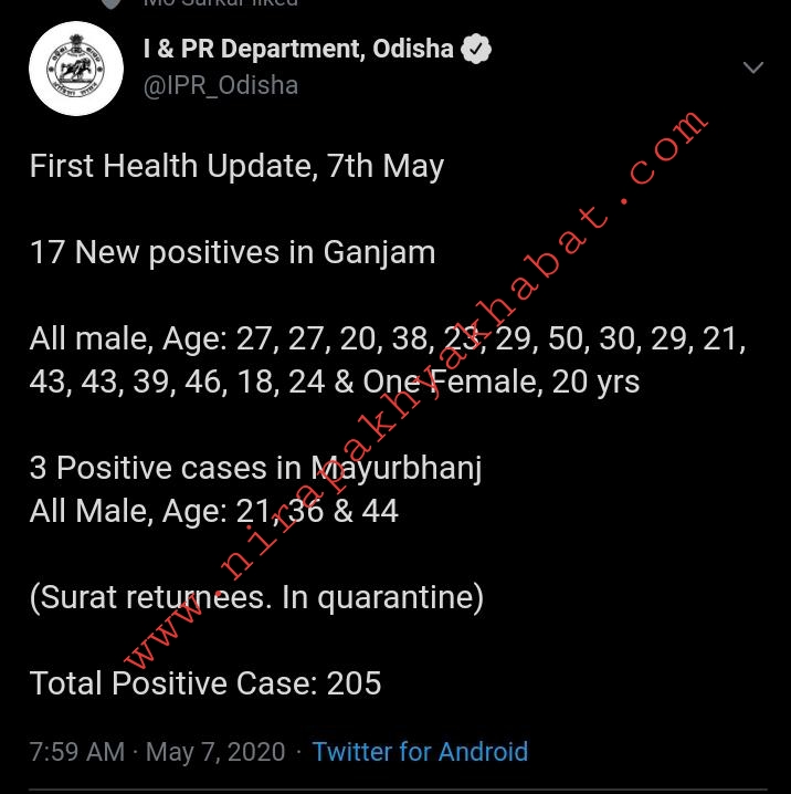ଭୁବନେଶ୍ୱର ,ନିରପେକ୍ଷ ଖବର:ତା-୭/୫/ ରାଜ୍ୟରେ ଦିନକୁ ଦିନ କାୟା ବିସ୍ତାର କରିବାରେ ଲାଗିଛି କରୋନା । ଏହି ମହାମାରୀକୁ ରୋକିବା ପାଇଁ ସରକାର ବିଭିନ୍ନ ପଦକ୍ଷେପ ନେଉଛନ୍ତି । କିନ୍ତୁ ରାଜ୍ୟରେ କରୋନା ସଂକ୍ରମିତଙ୍କ ସଂଖ୍ୟା ବଢିବାରେ ଲାଗିଛି । ଏହି ପରିପ୍ରେକ୍ଷୀରେ ରାଜ୍ୟରେ ଆଉ ୨୦କରୋନା ପଜିଟିଭ ଚିହ୍ନଟ ହୋଇଛନ୍ତି । ଫଳରେ ରାଜ୍ୟରେ ବର୍ତ୍ତମାନ ମୋଟ୍ କରୋନା ସଂକ୍ରମିତଙ୍କ ସଂଖ୍ୟା ୨୦୫ରେ ପହଞ୍ଚିଛି । ଏନେଇ ରାଜ୍ୟ ସ୍ବାସ୍ଥ୍ୟ ଓ ପରିବାର କଲ୍ୟାଣ ମନ୍ତ୍ରଣାଳୟ ଓ୍ବେବସାଇଟ୍ରେ ସୂଚନା ପ୍ରଦାନ କରାଯାଇଛି । ଆଜି ଚିହ୍ନଟ ହୋଇଥିବା ସଂକ୍ରମିତମାନଙ୍କ ମଧ୍ୟରୁ ୧୭ଜଣ ଗଞ୍ଜାମ ଜିଲ୍ଲାର ଥିବାବେଳେ ୩ଜଣ ମୟୁରଭଞ୍ଜ ଜିଲ୍ଲାର ରହିଛନ୍ତି । ତେବେ ମୟୁରଭଞ୍ଜ ଜିଲ୍ଲାରେ ପ୍ରଥମ ଥର କରୋନା ଚିହ୍ନଟ ହେବା ସହ ଏହି ଜିଲ୍ଲା ଏବେ କରୋନା ମ୍ୟାପ୍ରେ ଯୋଡି ହୋଇଛି ।