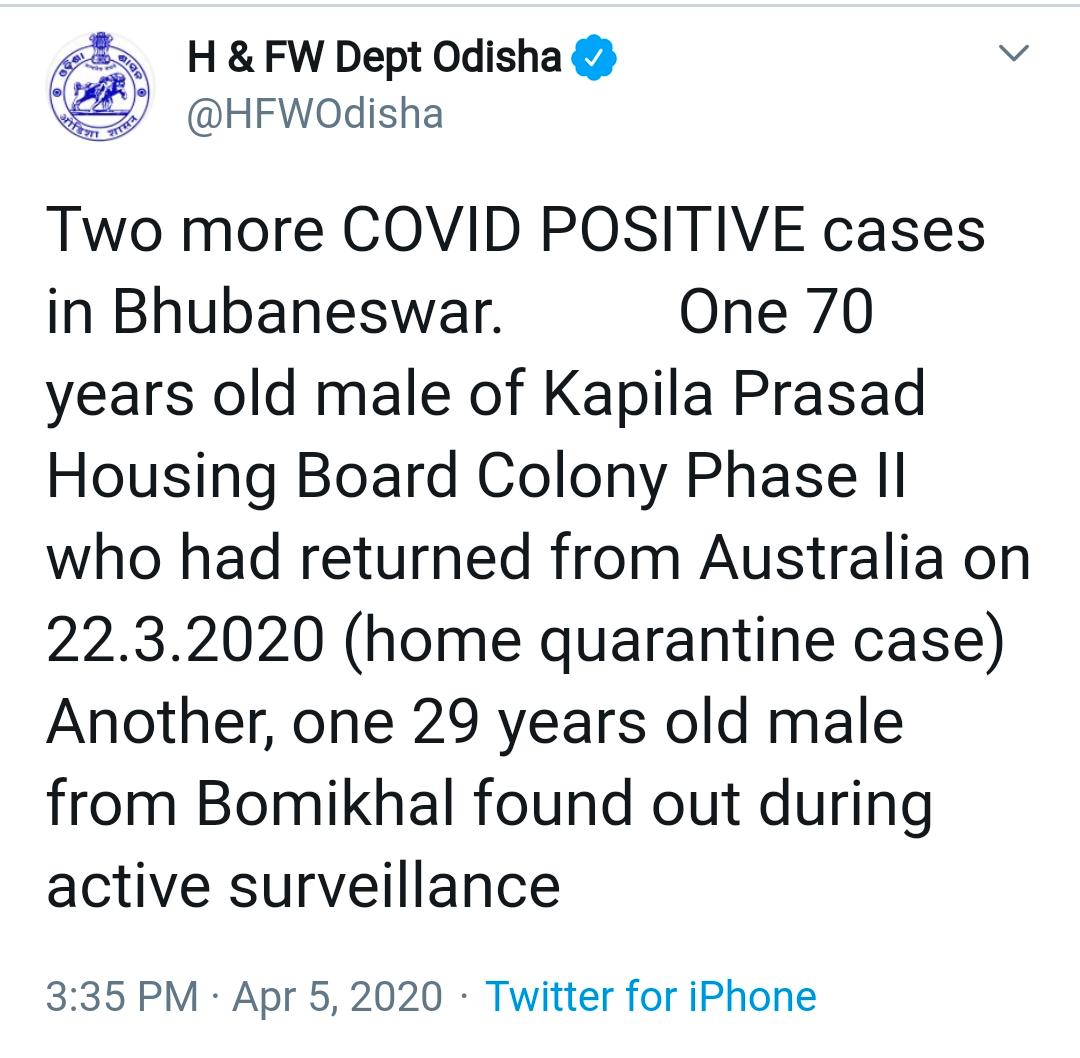 ଭୁବନେଶ୍ୱର, ନିରପେକ୍ଷ ଖବର:୦୫/୦୪ ଭୁବନେଶ୍ୱରରେ ଆଉ ୨ କରୋନା ଆକ୍ରାନ୍ତ ଚିହ୍ନଟ ହୋଇଛନ୍ତି। ବମିଖାଲ ଏବଂ କପିଳ ପ୍ରସାଦ ଅଞ୍ଚଳରୁ ୨ ଜଣ କରୋନା ପଜିଟିଭ ଥିବା ରବିବାର ଜଣାପଡିଛି। ୭୦ ବର୍ଷିୟ ବ୍ୟକ୍ତିଙ୍କ ନମୂନାରେ କରୋନା ପଜିଟିଭ ବାହାରିଛି। ବ୍ୟକ୍ତି ଜଣଙ୍କ କପିଳ ପ୍ରସାଦ ହାଉସିଂ ବୋର୍ଡ କଲୋନୀ ଫେଜ-୨ ଅଞ୍ଚଳର । ସେ ଅଷ୍ଟ୍ରେଲିଆରୁ ଫେରିଥିଲେ । ଗତ ୨୨ ତାରିଖରେ ସେ ଅଷ୍ଟ୍ରେଲିଆରୁ ଫେରିଥିବା ତାଙ୍କ ଗସ୍ତ ବିବରଣୀରେ ସ୍ପଷ୍ଟ । ତେବେ ବ୍ୟକ୍ତି ଜଣଙ୍କ ହୋମ କ୍ୱାରେଣ୍ଟାଇନରେ ଥିବା ନେଇ ସୂଚନା ଦେଲା ସ୍ୱାସ୍ଥ୍ୟ ବିଭାଗ ।ସେହିପରି ଅନ୍ୟ ଜଣେ କରୋନା ଆକ୍ରାନ୍ତ ବମିଖାଲ ଅଞ୍ଚଳର । ୨୯ ବର୍ଷିୟ ଯୁବକଙ୍କ ନମୂନା କୋଭିଡ-୧୯ ପଜିଟିଭ ।