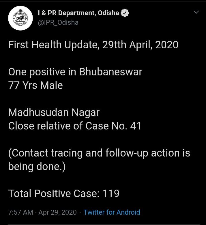 ସେ ଭୁବନେଶ୍ୱର ସ୍ଥିତ ମଧୁସୂଦନ ନଗର ଅଞ୍ଚଳର।ପ୍ରକାଶ ଥାଉକି ସେ କେସ୍ ନମ୍ବର ୪୧ର ନିକଟ ସମ୍ପର୍କୀୟ ଅଟନ୍ତି । ଏହାକୁ ମିଶାଇ ରାଜ୍ୟର ଆକ୍ରାନ୍ତଙ୍କ ସଂଖ୍ୟା ୧୧୯ ରେ ପହଞ୍ଚିଲା ।ଏହା ସୂଚନା ଓ ଲୋକସମ୍ପର୍କ ବିଭାଗ ପକ୍ଷରୁ ଟ୍ୱିଟ ମାଧ୍ୟମରେ ସୂଚନା ଦିଆଯାଇଛି । ବର୍ତ୍ତମାନ ପର୍ଯ୍ୟନ୍ତ ରାଜ୍ୟରେ ୩୮ ଜଣ କରୋନା ଆକ୍ରାନ୍ତ ସୁସ୍ଥ ହୋଇଥିବା ବେଳେ, ଜଣଙ୍କ ମୃତ୍ୟୁ ଘଟିଛି ଓ ୮୦ ଜଣ ରୋଗୀ ଏବେ ଆକ୍ଟିଭ ଅଛନ୍ତି ।