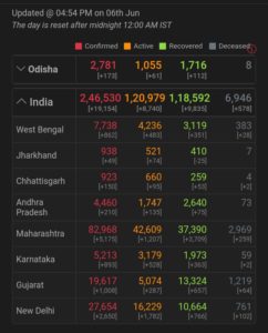 ଦେଶରେ ଏବେ ପର୍ଯ୍ୟନ୍ତ ଆକ୍ରାନ୍ତଙ୍କ ସଂଖ୍ୟା ୨ ଲକ୍ଷ ୪୬ ହଜାର ୫୪୯ ରେ ପହଂଚିଲା । ସେହିପରି ସୁସ୍ଥଙ୍କ ସଂଖ୍ୟ ମଧ୍ୟ ୧ଲକ୍ଷ ୧୪ ହଜାର ୭୩ ରେ ପହଁଚିଛି। କରୋନା ଆକ୍ରାନ୍ତରେ ଦେଶରେ ୬ହଜାର ୬୪୨ ଜଣଙ୍କ ଜୀବନ ଚାଲିଯାଇଥିବା ବେଳେ ଏବେ ବିଭିନ୍ନ କୋଭିଡ ହସ୍ପିଟାଲରେ ୧ ଲକ୍ଷ ୧୫ ହଜାର ୯୪୨ ଜଣ ଚିକିତ୍ସିତ ଅବସ୍ଥାରେ ଅଛନ୍ତି। ଏବେ ପର୍ଯ୍ୟନ୍ତ ବିଶ୍ୱରେ କରୋନା ମୃତ୍ୟୁ ସଂଖ୍ୟା ୪ ଲକ୍ଷରେ ପହଂଚିଲା । ବିଶ୍ୱରେ ମୋଟ୍ ଆକ୍ରାନ୍ତଙ୍କ ସଂଖ୍ୟ ୬୯ ଲକ୍ଷ ଛୁଇଁଛି ।