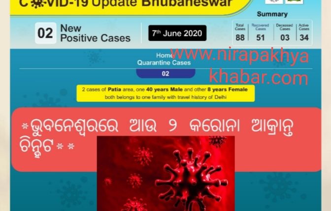 ଭୁବନେଶ୍ୱର, ନିରପେକ୍ଷ ଖବର:ତା ୦୭/୦୬ ରାଜଧାନୀରେ ଆଜି ଆଉ ୨ କରୋନା ଆକ୍ରାନ୍ତ ଚିନ୍ହଟ ହୋଇଛନ୍ତି। ପଟିଆ ଅଞ୍ଚଳରେ ଗୋଟିଏ ପରିବାରର ସଦସ୍ୟ ୨ଜଣ । ଜଣେ ପୁରୁଷ ବୟସ ୪୦ ଓ ଅନ୍ୟ ଜଣେ ଝିଅ ୮ ବର୍ଷୀୟ। ଦୁହିଁଙ୍କ ଟ୍ରାଭେଲ୍ ହିଷ୍ଟ୍ରି ଦିଲ୍ଲୀ ଗସ୍ତ ରହିଛି। ଦିଲ୍ଲୀରୁ ଫେରି ୨ଜଣ ହୋମକୁରେଣ୍ଟଆଇନ୍ ରେ ଥିଲେ।ଏମାନଙ୍କୁ ମିଶାଇ ଭୁବନେଶ୍ୱରରେ ଆକ୍ରାନ୍ତଙ୍କ ସଂଖ୍ୟା ୮୮ ରେ ପହଂଚିଲା। ଚିକିତ୍ସିତ ହେଉଛନ୍ତି ୩୪, ସୁସ୍ଥ ହେଇଛନ୍ତି ୫୧ ଓ ମୃତ୍ୟୁ ବରଣ କରିଥିବା ସଂଖ୍ୟା ୩। ଏନେଇ ଆଜି ରାଜ୍ୟ ସ୍ୱାସ୍ଥ୍ୟ କଲ୍ୟାଣ ବିଭାଗ ପକ୍ଷରୁ ଟୁଇଟ୍ ମାଧ୍ୟମରେ ସୂଚନା ଦେଇଛନ୍ତି ।