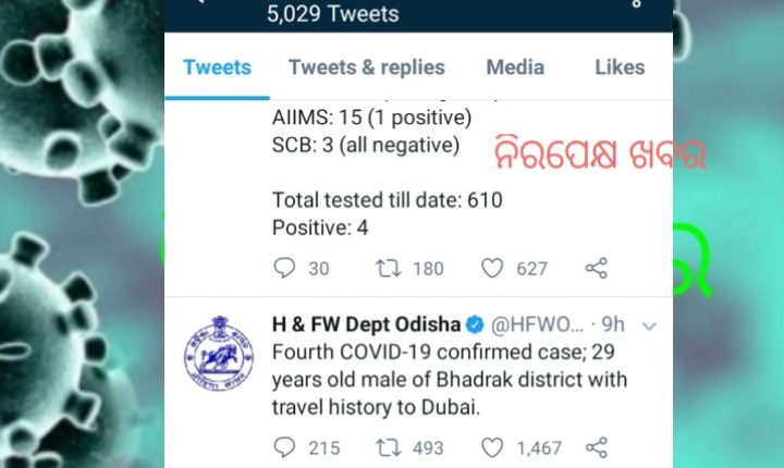 ଭୁବନେଶ୍ୱର,ନିରପେକ୍ଷ ଖବର: ଓଡ଼ିଶାରେ ଚତୁର୍ଥ କରୋନା ରୋଗୀ ଭଦ୍ରକରେ ଚିହ୍ନଟ ହୋଇଛନ୍ତି । ତାଙ୍କ ଘର ଭଦ୍ରକ ହୋଇଥିବା ଜଣାପଡିଛି।ଚିହ୍ନଟ ହୋଇ ଥିବା ରୋଗୀ ଜଣକ ଦୁବାଇରୁ ଫେରିଥିବା ବେଳେ ତାଙ୍କ ସ୍ୱାସ୍ଥ୍ୟ ପରୀକ୍ଷାରୁ ରିପୋର୍ଟରେ କରୋନା ପଜିଟିଭ ଥିବା ଜଣାପଡ଼ିଛି। ଏନେଇ ରାଜ୍ୟ ସ୍ୱାସ୍ଥ୍ୟ ଓ ପରିବାର କଲ୍ୟାଣ ପକ୍ଷରୁ ଟୁଇଟ୍ ମାଧ୍ୟମରେ ସୂଚନା ଦିଆଯାଇଛି । ଏହା ପୂର୍ବରୁ ଓଡ଼ିଶାରରେ ୩ ଜଣ ରୋଗୀ ଚିହ୍ନଟ ହୋଇଥିଲେ ।କରୋନା ରୋଗୀ ଭାରତରେ ଏବେ ଦ୍ରୁତ ଗତିରେ     ବଢ଼ିବାରେ ଲିଗିଛନ୍ତି । ଆଜି ୩୧:୦୩:୨୦୨୦ ମଙ୍ଗଳବାର ଗୋଟିଏ ଦିନରେ ୨ଶହରୁ ଅଧିକ ଲୋକ କୋଭିଡ୍‌-୧୯ ଭୂତାଣରୁରେ ଆକ୍ରାନ୍ତ ହୋଇଥିବା ପରୀକ୍ଷାରୁ ଜଣାପଡ଼ିଛି। ଏହି ଭାଇରସରେ ଆକ୍ରାନ୍ତ ହୋଇଥିବା ବୋହୁ ମାତ୍ରାରେ ଲୋକମାନେ ଦିଲ୍ଲୀର ନିଜାମୁଦ୍ଦିନ ମସଜିଦରେ ଯୋଗଦେଇଥିବା ଜଣାପଡ଼ିଛି।