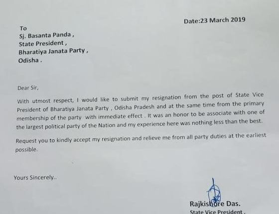 ଭୁବନେଶ୍ୱର:ନିରପେକ୍ଷ ଖବର ଭାରତୀୟ ଜନତା ପାର୍ଟିର ରାଜ୍ୟ ଉପ-ସଭାପତି ରାଜକିଶୋର ଦାସ ଦଳ ଛାଡ଼ିଛନ୍ତି। ରାଜକିଶୋର ଦାସ ।ନିଜର ଇସ୍ତଫା ପତ୍ରକୁ ରାଜ୍ୟ ସଭାପତି ବସନ୍ତ ପଣ୍ଡାଙ୍କୁ ପଠାଇଛନ୍ତି। ଏହା ସହ ସେ ନିଜର ମନ୍ତବ୍ୟରେ କହିଛନ୍ତି ମୁଁ ଦେଶର ବୃହତ୍ତ ପାର୍ଟି ସହିତ କାମ କରି ଖୁସି ଅନୁଭବ କରିଛି ।