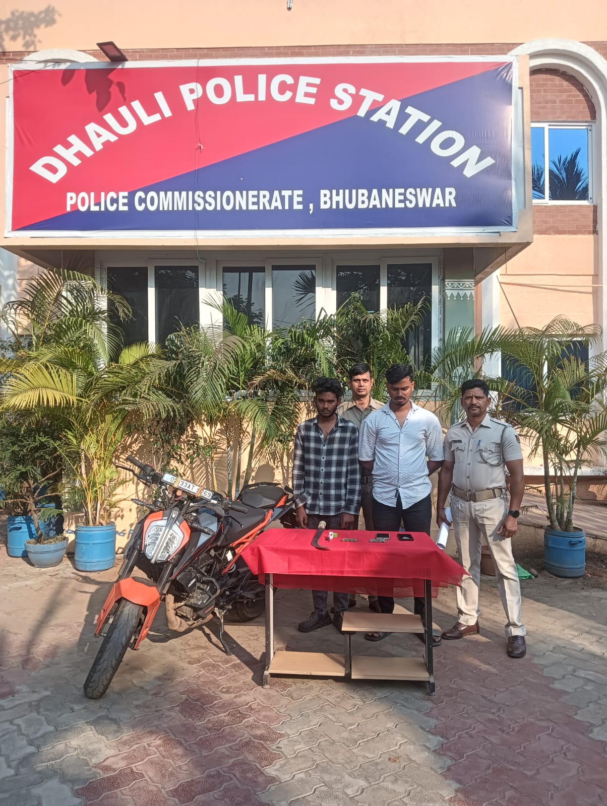 ଭୁବନେଶ୍ୱର,ନିରପେକ୍ଷ ଖବର:ତା ୧୨/୦୩ ଭୁବନେଶ୍ୱରରେ ଅସ୍ତ୍ର ସହ ଦୁଇ ଅଭିଯୁକ୍ତଙ୍କୁ ଧରିଲା ପୋଲିସ। ଧୌଳି ଥାନା ଅଧୀନ ଶିଶୁପାଳଗଡ଼ ଗେଟ୍ ନିକଟରେ ପାଟ୍ରୋଲିଂ ସମୟରେ ପୋଲିସ ସନ୍ଦେହଜନକ ଭାବେ ଘୁରୁଥିବା ଦୁଇଜଣଙ୍କୁ କାବୁ କରିଥିଲା। ଧରାପଡ଼ିଥିବା ଅଭିଯୁକ୍ତମାନେ ହେଲେ ସୁଭମ ଚନ୍ଦ୍ର ନାୟକ ଓ ଆକାଶ ଉର୍ଫ ସମୀର ଚନ୍ଦ୍ର ଦାସ। ସେମାନଙ୍କ ପାଖରୁ ଦୁଇଟି ଧାତୁର କଣ୍ଟା ସହ ଏକ ବଡ଼ ଧାରୁଆ ତେଲେଙ୍ଗା ଖଣ୍ଡା ଜବତ କରାଯାଇଛି। ପୋଲିସ କହିଛି, ଅଭିଯୁକ୍ତମାନେ NH–316 ବାଇପାସ୍ ରାସ୍ତାରେ ଲୋକମାନଙ୍କ ଉପରେ ଆକ୍ରମଣ ଓ ଛିନତାଇ କରିବା ଉଦ୍ଦେଶ୍ୟରେ ବୁଲାବୁଲି କରୁଥିଲେ।